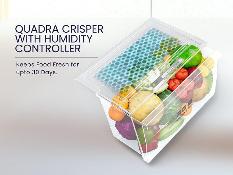 - Quadra Crisper with Humidity Control: Keeps fruits and vegetables fresh for up to 30 days with a honeycomb moisture-retaining design.